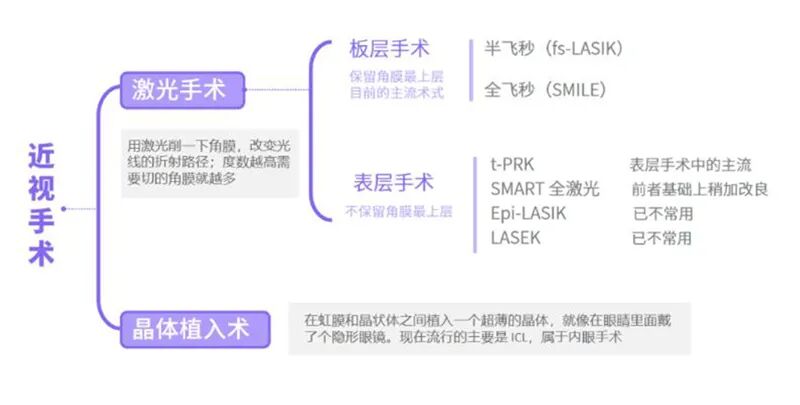 近视眼手术以激光角膜手术和晶体植入为主,激光角膜手术可以大体分为三类:制瓣类,以半飞秒手术为手术代表;表层类,以Trans-PRK为代表;透镜类技术,以全飞秒手术为代表。